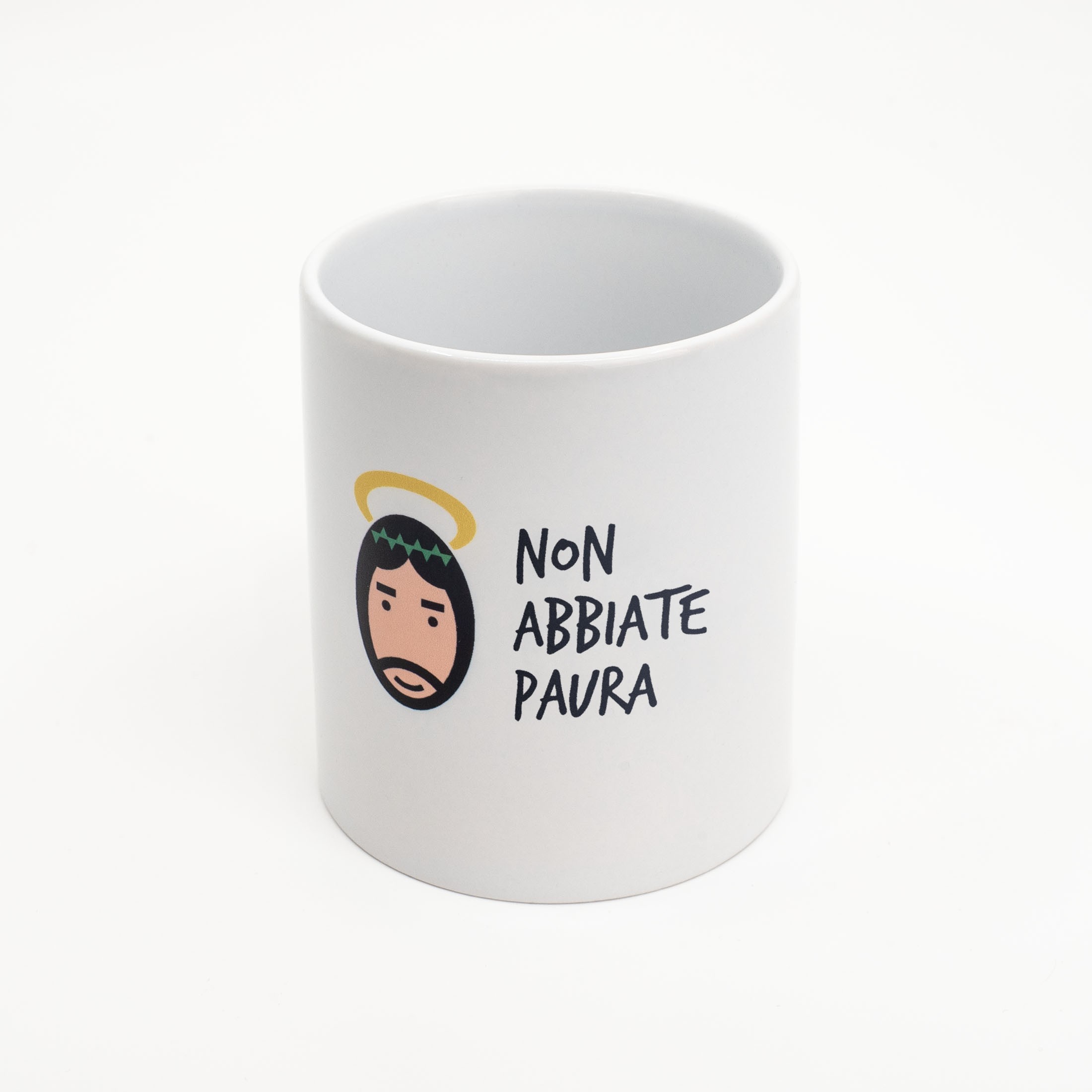 Tazza bianca in ceramica 320 ml, dal design classico, stampa dell’icona Shiloh con frase: Non abbiate paura.